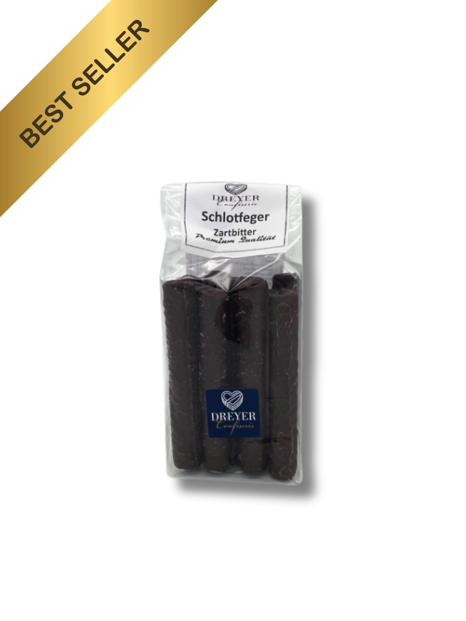 Der „Schlotfeger Zartbitter“ der Dreyer Confiserie ist ein edles Waffelgebäck, das mit kräftiger Zartbitterschokolade (60 % Kakao mindestens) umhüllt ist. Die harmonische Kombination aus feiner Knusperwaffel und herber Schokolade sorgt für ein intensives Geschmackserlebnis – ideal für alle, die dunkle Schokolade lieben.